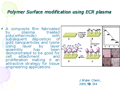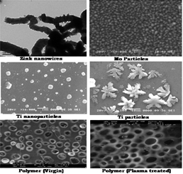 ECR plasma assisted deposition of nano, Zn, Mo, Ti and polymer surface modification. Fig: SEM images of Zn nanowires Mo, Ti nanoparticles and polymide surface modification